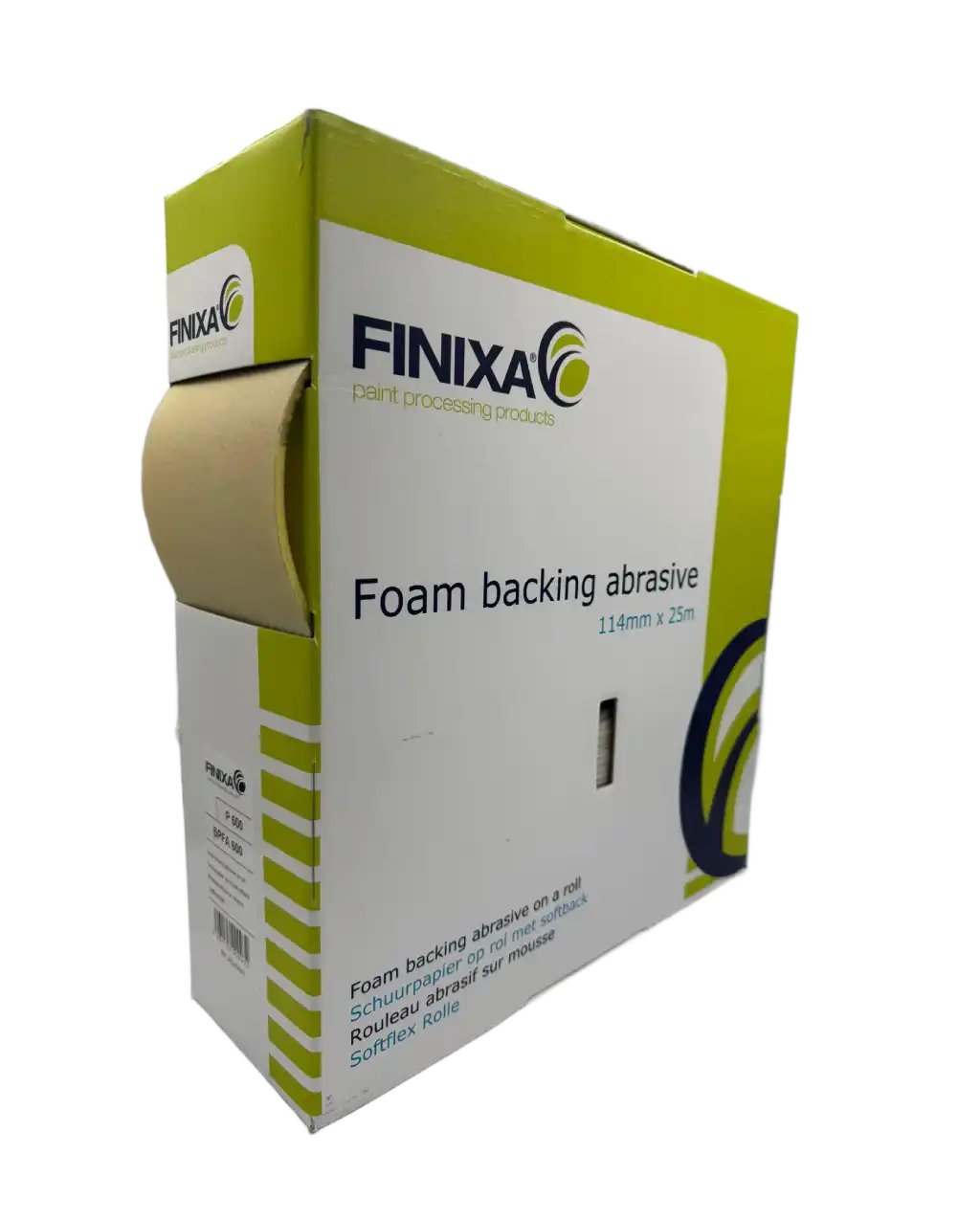 Finixa foam backing abrasive on a roll 114mm X 25m: This product is a flexible sanding paper, delivered in a handy dispenser box. It is designed specifically for manual sanding of contoured, rounded, or concave surfaces where even pressure is required to avoid “sanding through” at the edges.